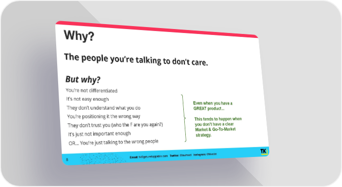 Why? The people you’re talking to don’t care. But why? You’re not differentiated It’s not easy enough Even when you have a They don’t understand what you do GREAT product... You’re positioning it the wrong way This tends to happen when They don’t trust you (who the F are you again?) you don’t have a clear Market & Go-To-Market It’s just not important enough strategy. OR… You’re just talking to the wrong people 8 Email: [email protected] Twitter: @tawheed Instagram: @tkkader