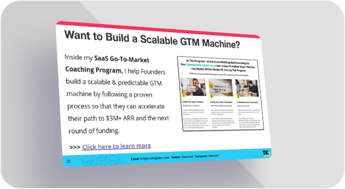 Want to Build a Scalable GTM Machine? Inside my SaaS Go-To-Market Coaching Program, I help Founders build a scalable & predictable GTM machine by following a proven process so that they can accelerate their path to $3M+ ARR and the next round of funding. >>> Click here to learn more 22 Email: [email protected] Twitter: @tawheed Instagram: @tkkader