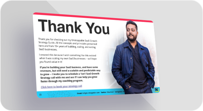 Thank You Thank you for checking out my Unstoppable SaaS Growth Strategy Guide. All the concepts and principles presented here are from 15+ years of building, scaling, and exiting SaaS businesses. I created this because I wish something like this existed when I was scaling my own SaaS businesses -- so I hope you found value in it! If you’re building your SaaS business, and have some revenues, but still need a scalable and predictable way to grow -- I invite you to schedule a 1on1 SaaS Growth Strategy call with me and see if I can help you grow faster through my coaching program. Click here to book your strategy call 23 Email: [email protected] Twitter: @tawheed Instagram: @tkkader