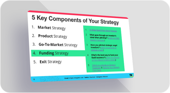 5 Key Components of Your Strategy 1. 12-Slide SaaS Pitch Deck Training 1. Market Strategy 2. What goes through an investor’s mind when pitching? (watch my Pitch 2. Product Strategy Meeting Teardown) 3. Have you pitched strategic angel 3. Go-To-Market Strategy investors? (watch my episode on strategic angels) 4. Funding Strategy 4. What’s the best way to fund your SaaS business? (watch my episode on the different funding options) 5. Exit Strategy 5. Watch my episode on Series A Readiness & Building Your Series A Pitch Deck 18 Email: [email protected] Twitter: @tawheed Instagram: @tkkader