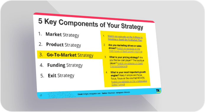 5 Key Components of Your Strategy 1. Watch my episode on the 6-Steps to 1. Market Strategy Creating a SaaS Go-To-Market Plan 2. Are you marketing driven or sales 2. Product Strategy driven? (watch my episode on the TWO types of SaaS growth engines) 3. Go-To-Market Strategy 3. What is your pricing strategy? Are you the low cost player? The boutique player? (watch my episode on SaaS 4. Funding Strategy Pricing Strategies) 4. What is your most important growth 5. Exit Strategy engine? Keep it simple and focus, focus, focus on the one that MOVES. (watch my episode on the Unstoppable Sales Funnel) 17 Email: [email protected] Twitter: @tawheed Instagram: @tkkader